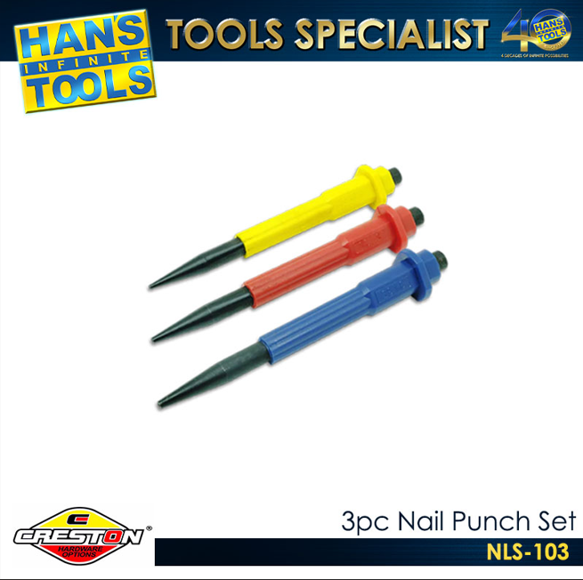 The Creston NLS-103 3-pc Nail Punch Set is a precision toolkit designed for finishing carpentry and woodworking tasks. It includes three nail punches of varying sizes, allowing for accurate countersinking of nails without damaging the surrounding surface. Manufactured from high-quality, hardened steel, each punch offers durability and reliable performance. The ergonomic design provides a comfortable grip for improved control and precision during use. Compact and practical, this set is ideal for professional craftsmen and DIY enthusiasts who require clean and precise finishing work.
