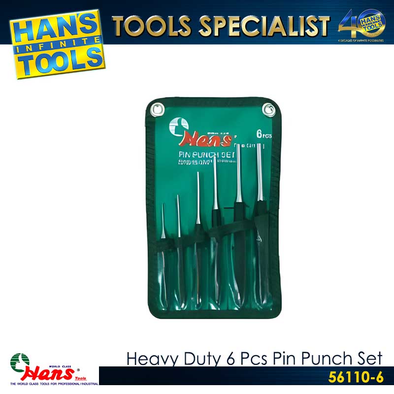 The Hans 56110-6 is a professional-grade striking tool set designed for driving out pins, rivets, and bolts that are seized or tightly fitted. Labeled “Extra Heavy Duty,” these punches are engineered to withstand repeated high-velocity hammer blows without bending or mushrooming.