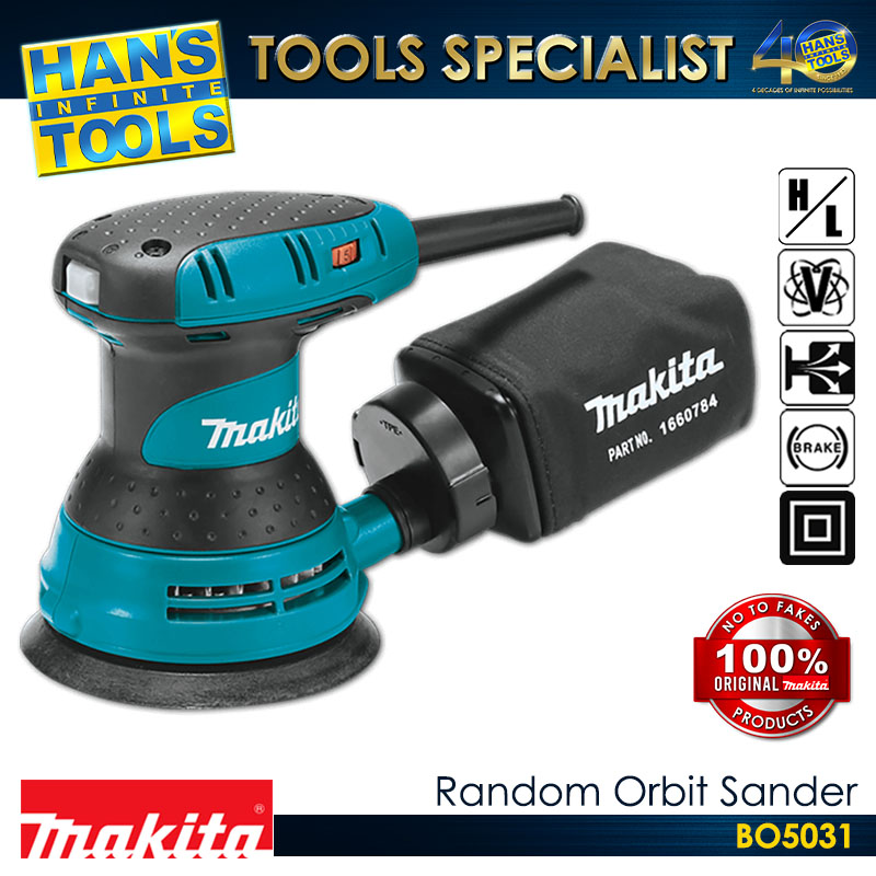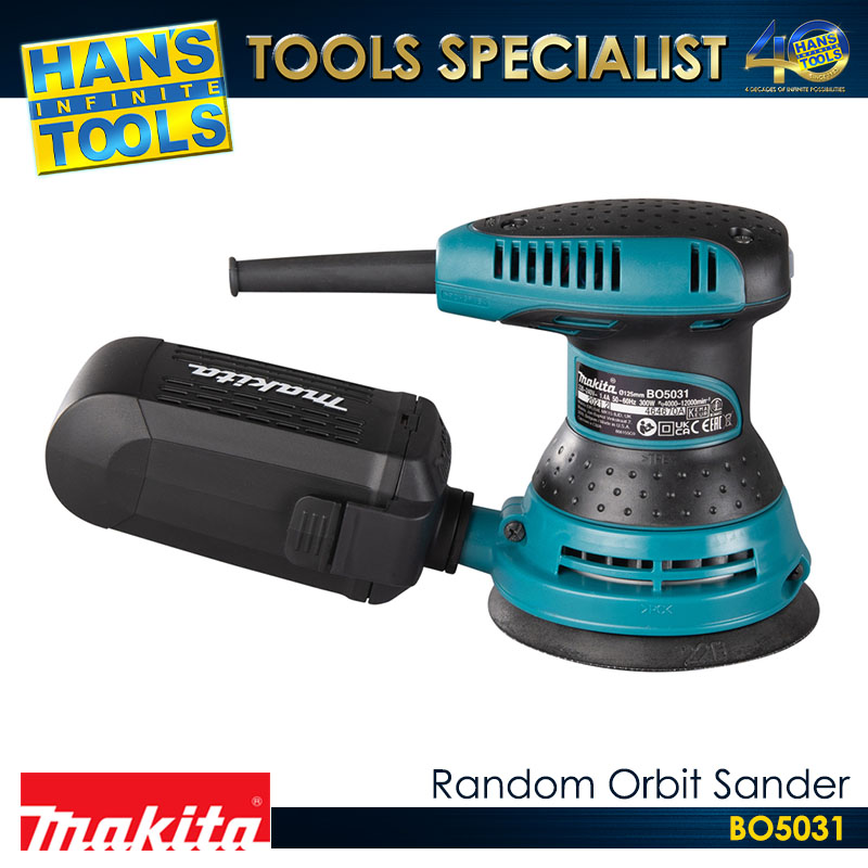 - Uses quick change 125 mm (5″) (8-hole) hook-and-loop abrasive paper