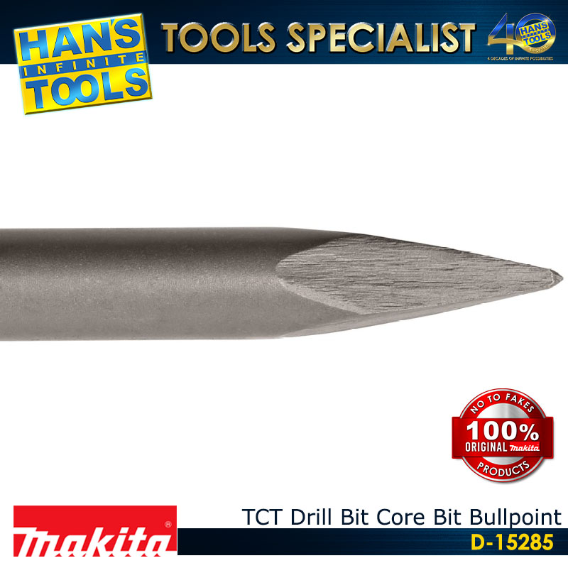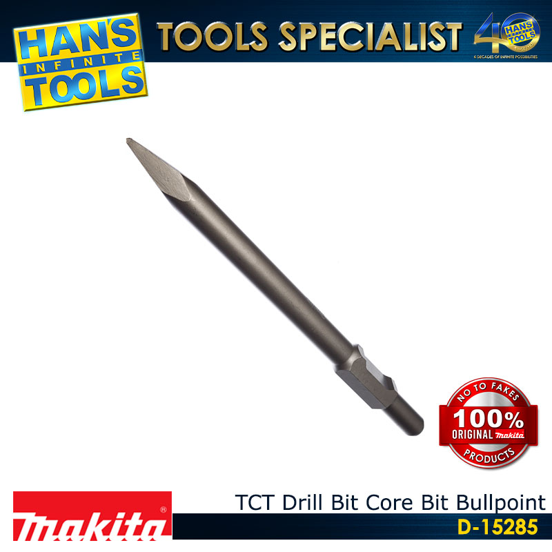 The Makita D‑15285 TCT Drill Bit Bullpoint is a demolition accessory designed for rotary hammers, featuring a Tungsten Carbide Tipped (TCT) bullpoint head for concentrated impact force. It is intended for breaking, chipping, and controlled demolition of concrete, stone, and masonry in heavy construction and renovation work.