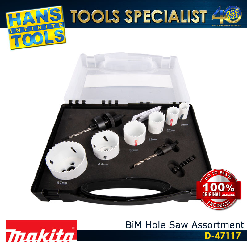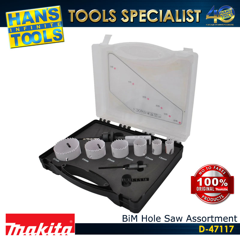 The Makita D‑47117 BIM Hole Saw Assortment is a compact professional kit containing multiple Bi‑Metal (BiM) hole saws with arbor accessories, designed for versatile cutting in wood, metal, and plastics. It is a smaller assortment compared to the D‑47123, making it ideal for technicians who need a practical range of hole sizes without carrying a full set.