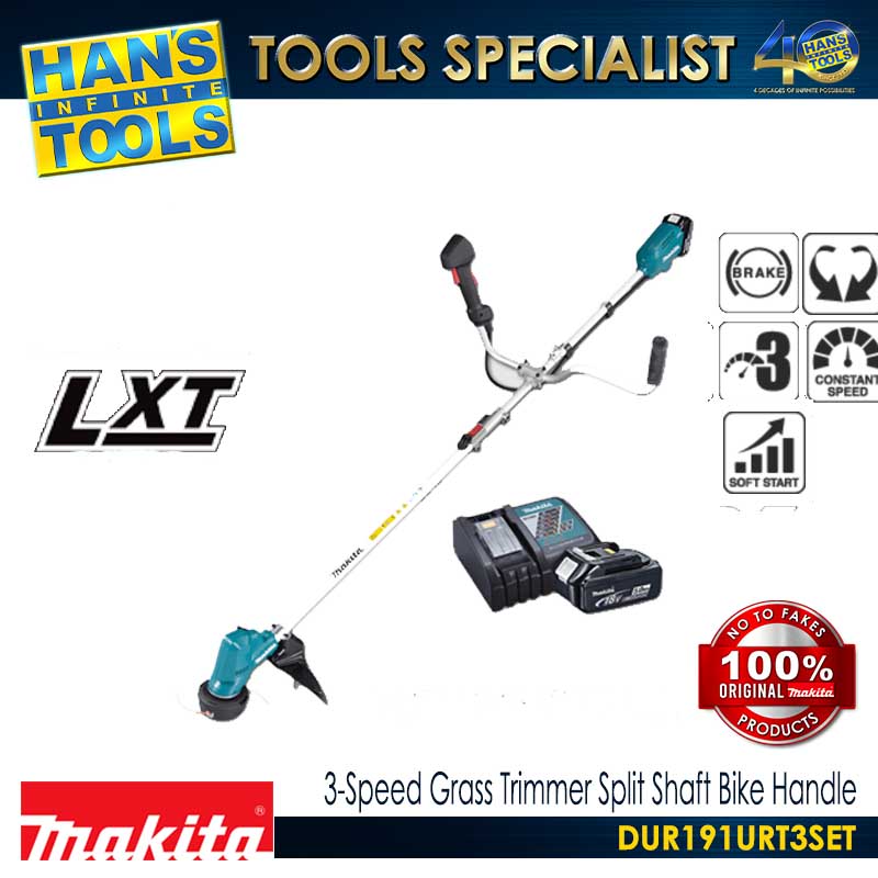18V LXT cordless 3-speed grass trimmer featuring a professional bike-handle (U-handle) configuration for ergonomic, wide-swinging clearing of large grassy areas.