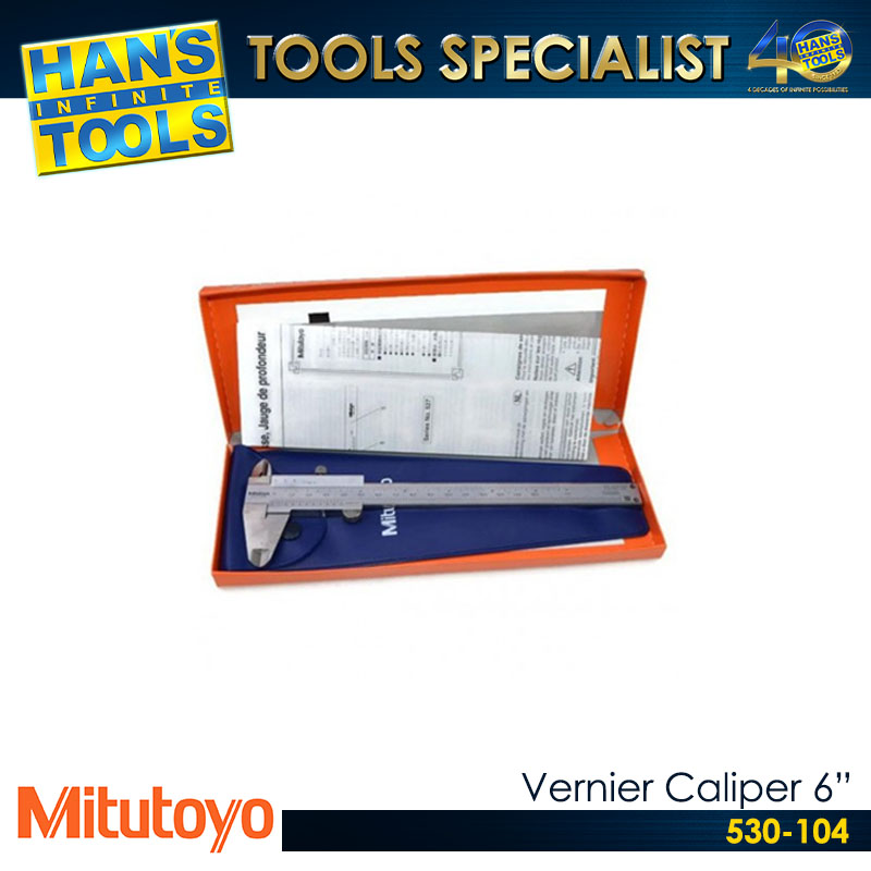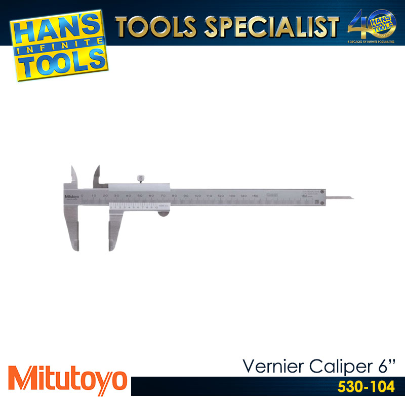 The Mitutoyo 530-104 is a standard, dual-scale vernier caliper measuring 0-150mm (0-6″) with 0.05mm/1/128″ graduation, ±0.05mm accuracy, and hardened stainless steel construction for 4-way measurements (OD, ID, depth, step). It features a small 14° vernier angle for easy reading, a lock screw, satin chrome finish, and comes with a vinyl holster.
