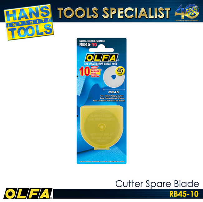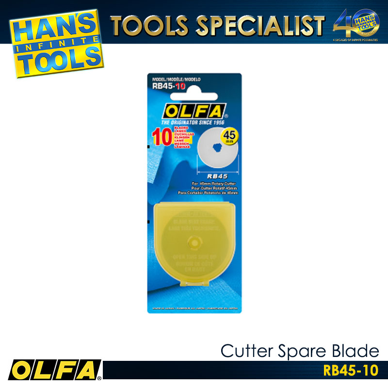The OLFA RB45-10 Cutter Spare Blade is a high-quality replacement blade designed for precision and durability. It is made from premium tungsten tool steel to ensure long-lasting sharpness and consistent cutting performance. These 45mm rotary blades are ideal for cutting fabric, paper, vinyl, and other materials with smooth, clean edges. Each pack contains ten blades, making it suitable for both professional and heavy-duty use. The RB45-10 blades are compatible with most standard 45mm rotary cutters, ensuring versatility and convenience.