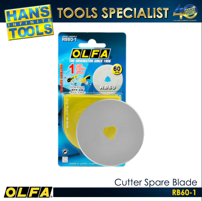 The OLFA RB60-1 Cutter Spare Blade is a high-quality replacement blade designed for 60mm rotary cutters used in heavy-duty cutting tasks. It is manufactured from premium tool steel to ensure long-lasting sharpness and reliable durability. The blade is suitable for cutting thick materials such as carpet, leather, rubber, and multiple layers of fabric with clean and precise results. Its large 60mm size allows for efficient and smooth cutting over wide surfaces, reducing effort and increasing productivity. The RB60-1 pack contains one blade, providing a practical solution for maintaining optimal cutting performance.