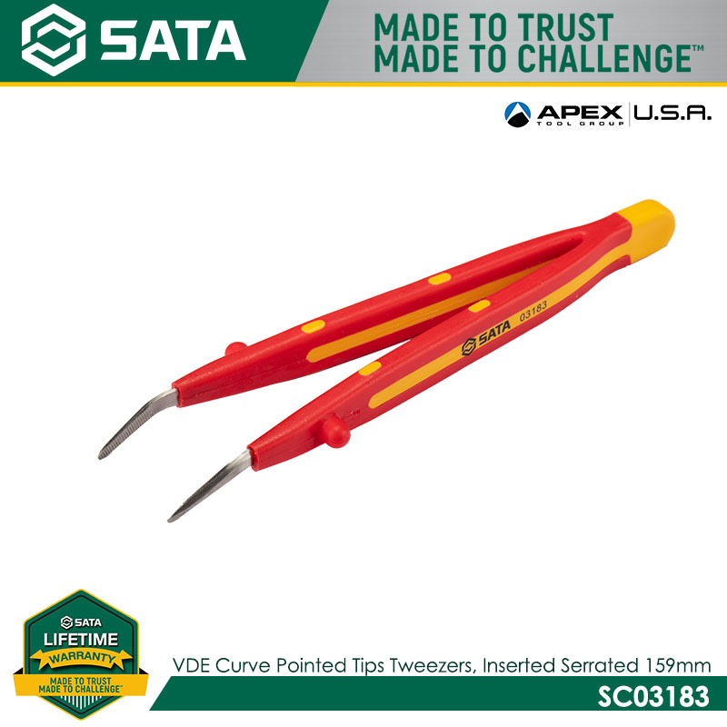 SATA SC03183 VDE Curved Pointed Tips Tweezers, Inside Serrated 159mm