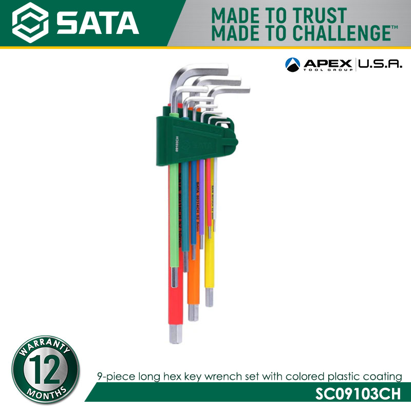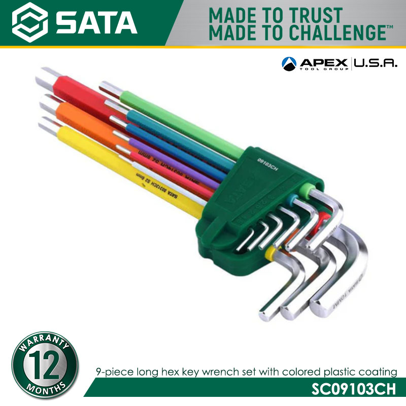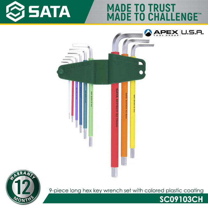 The SATA SC09103CH is a 9‑piece extra‑long hex key wrench set with colored plastic coating, designed for durability, easy identification, and comfortable grip. It covers sizes from 1.5 mm to 10 mm, making it versatile for professional and DIY use.