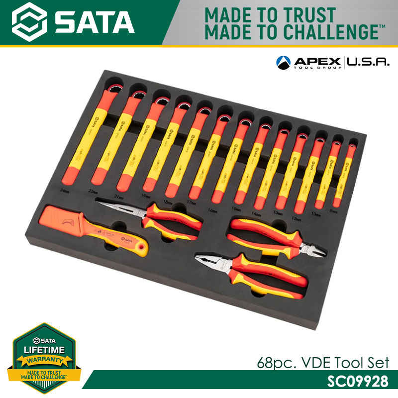 The SATA SC09928 68-piece VDE Tool Set is a professional insulated hand tool kit designed for safe work on electrical systems, including high-voltage applications. Certified to VDE/IEC standards, the tools provide protection up to 1000V AC, making them suitable for electricians, industrial technicians, and EV service professionals. The set is organized in a foam tray for easy storage and identification.