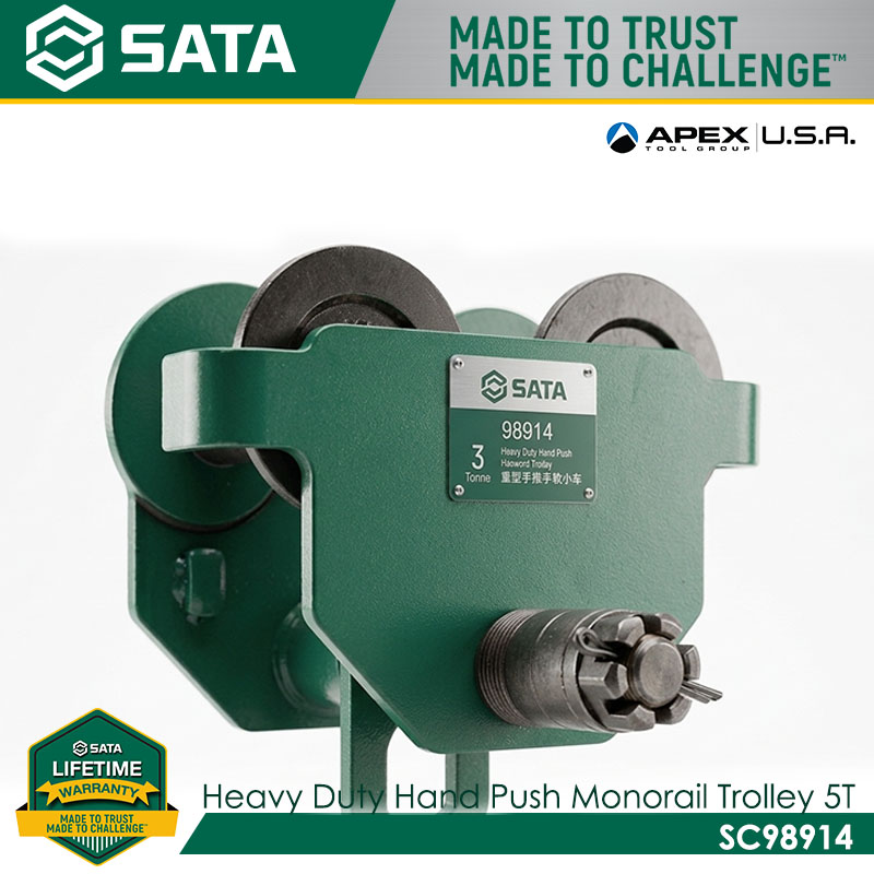 The SATA SC98914 Heavy Duty Hand Push Monorail Trolley (5T) is an industrial-grade trolley designed for manual movement of heavy loads along I-beams or monorail tracks. With a 5-ton load capacity, it is ideal for factories, warehouses, and construction sites where safe and efficient material handling of very heavy equipment is required.