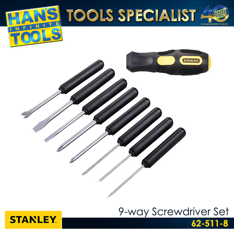 The Stanley 62511-8 9-way Screwdriver Set is a versatile and compact tool set designed to handle a wide range of fastening tasks. It features interchangeable screwdriver bits, allowing quick and convenient adaptation to different screw types and sizes. Each bit and handle is constructed from high-quality materials for durability and long-lasting performance. The ergonomic handle provides a comfortable grip, ensuring precise control during use. Ideal for both professional and DIY applications, this 9-way screwdriver set delivers efficient, reliable, and organized fastening solutions.