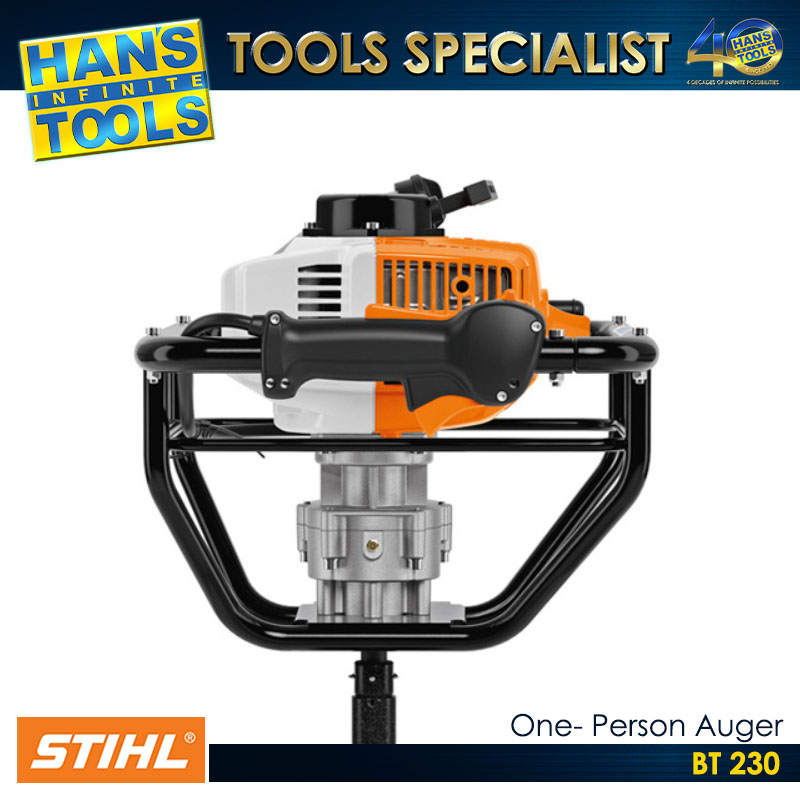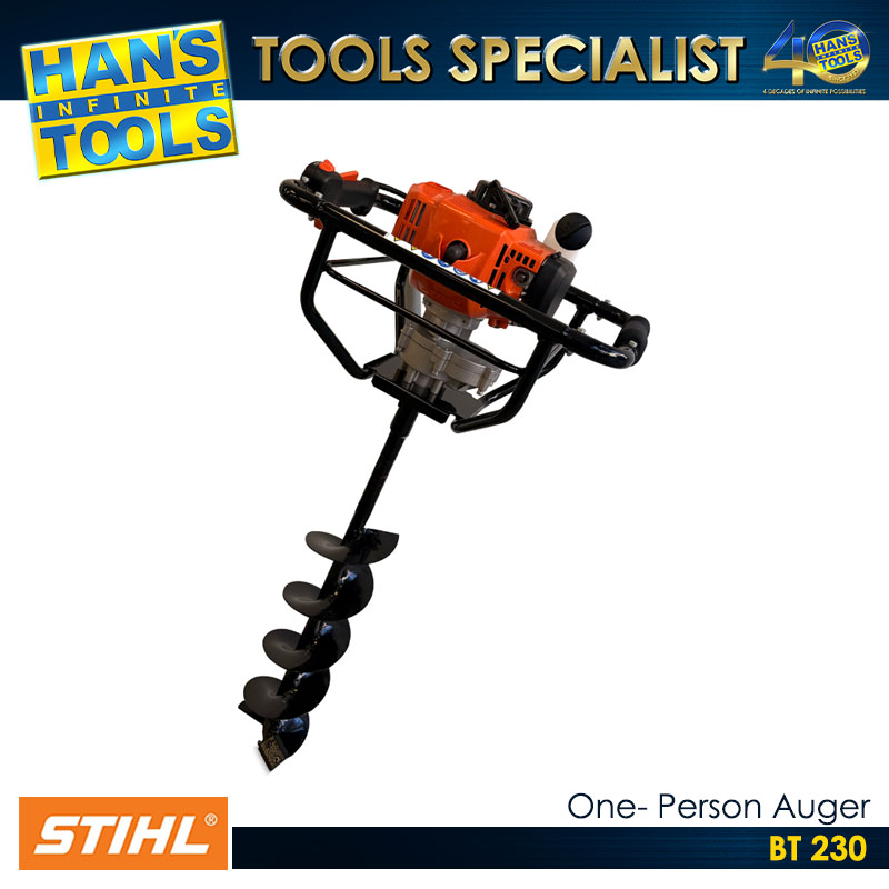 The STIHL BT 230 is a one-person petrol-powered earth auger designed for drilling holes in soil, making it ideal for agriculture, landscaping, and construction tasks. It’s a robust tool for fence posts, planting, and ground sampling.
