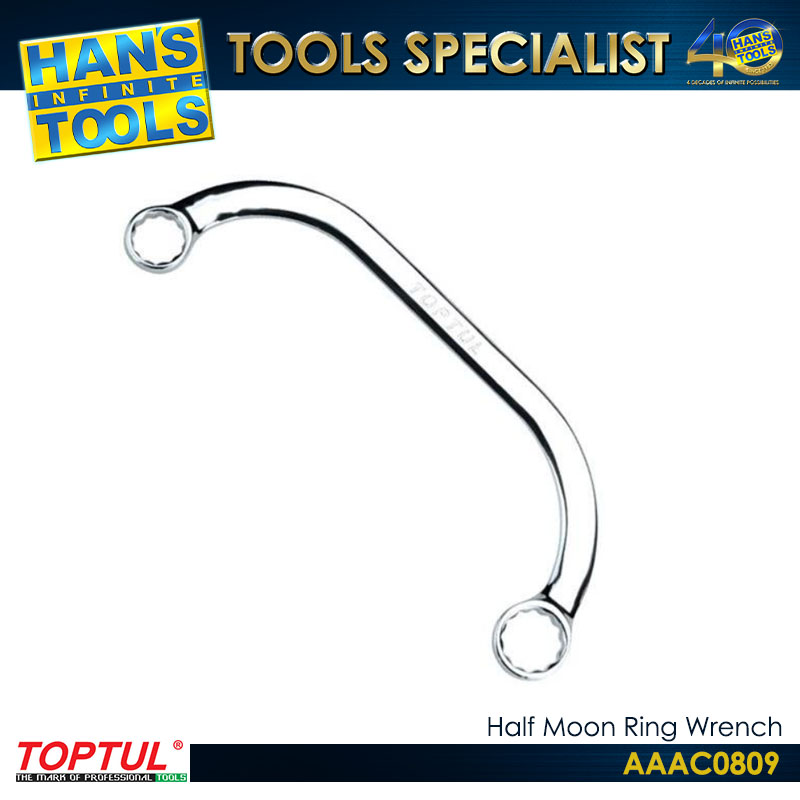 The TOPTUL AAAC0809 is a professional-grade 8×9 mm Half Moon Ring Wrench (also referred to as a starter or block spanner) designed for accessing fasteners in tight, restricted, or curved areas, particularly hard-to-reach starter motor bolts