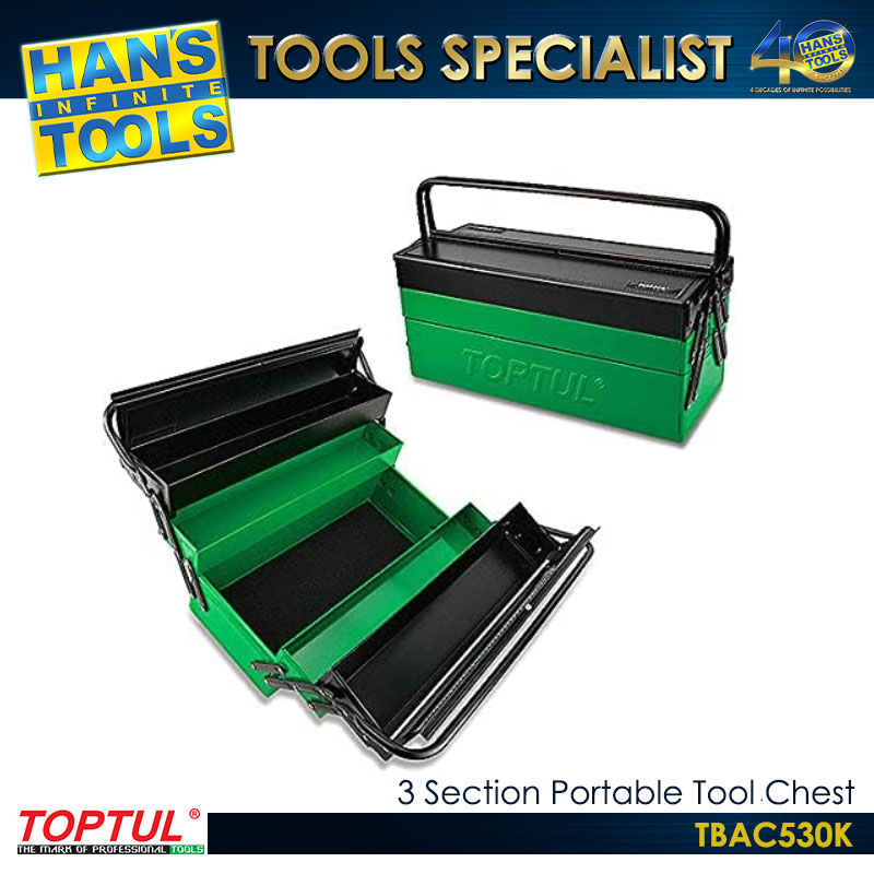 The TOPTUL TBAC530K is a professional-grade, 21-inch 3-section portable steel tool chest designed for organized tool storage and easy transport. It features a cantilever-style folding design that provides quick access to all compartments simultaneously.